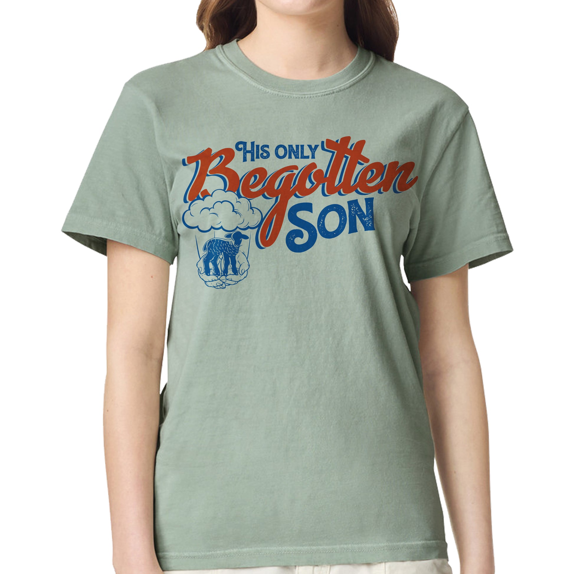 Christian Design featuring ‘His Only Begotten Son’ with lamb and cloud design. A bold scripture-inspired Print to share your faith in Jesus Christ.